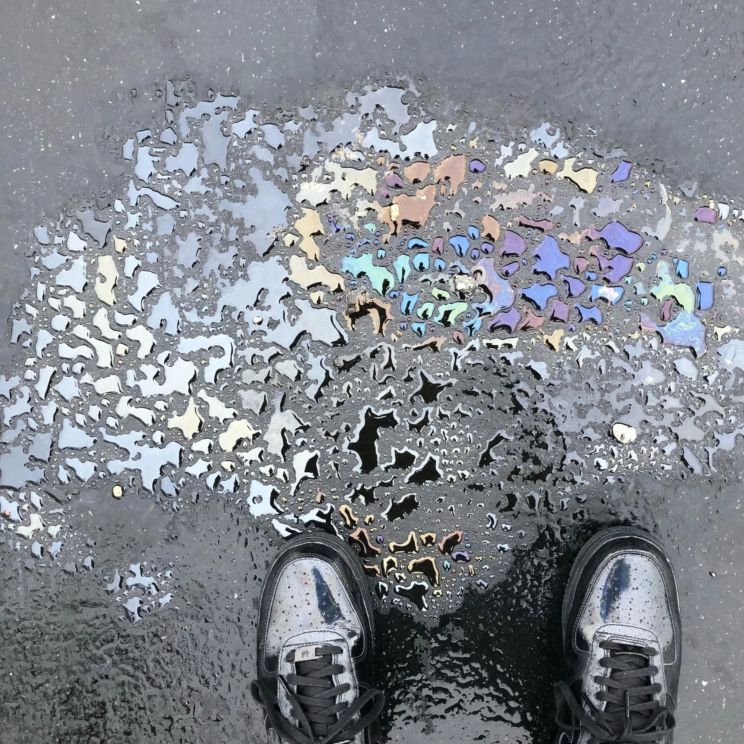 This image was taken on my iPhone in a parking lot on a rainy day, and those are my feet wearing my pair of Nike Air Force 1 Low in Iridescent Black. Though I came across this by chance, it perfectly sums up my passion for colors, textures, and patterns.